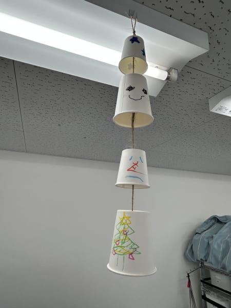 紙コップを紐に繋げるとゆらゆら揺れる紙コップ雪だるまの完成😄