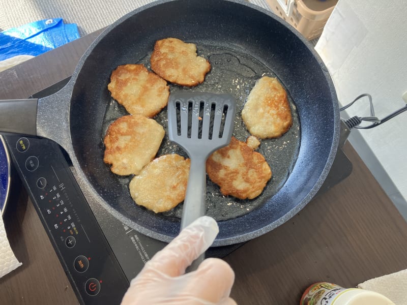 じゃがいもをつぶして、片栗粉と混ぜ合わせて、塩コショウで味付けをして成型して…